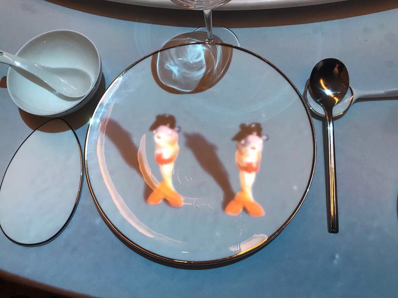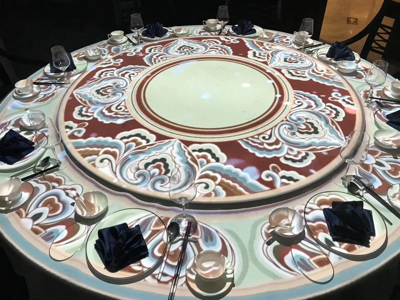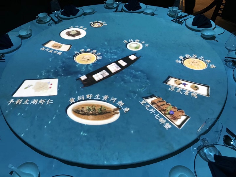 中餐新媒体互动桌面投影,北京南锣鼓巷,1000平方米四合院改造空间,地面投影,全息金字塔,定点投影,宋代绘画动态等各系统紧密协作;新媒体艺术不是炫技,是与经营和本地文化紧密相生的。